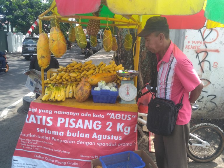 JABAR NEWS | PURWAKARTA – Kemeriahan Hari Ulang Tahun (HUT) RI Ke-72 ini mungkin menjadi berkah tersendiri bagi yang bernama Agus. Sepanjang BUlan Agustus ini pisang Gratis tersedia khusus bagi anda yang bernama Agus. Tak tanggung-tanggung, sebanyak 26 kilogram pisang jenis Sunrise disiapkan setiap harinya.
