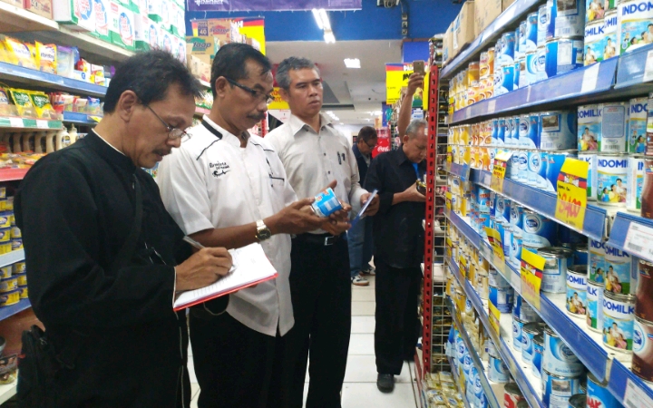Petugas menemukan minuman kemasan yang sudah kadaluarsa namun tetap dipajang, di salah satu pasar modern, Selasa (29/08/2017). (Foto: Red)