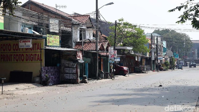 Toko-toko di sekitar jalan ini terlihat tutup sejak pagi hari. Meskipun ada sebagian pedagang yang masih membuka tokonya, berharap masih bisa mendapatkan rezeki.