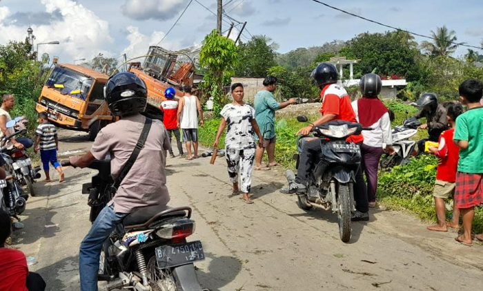 Ia menambahkan, sebagian dari turk sebelah kiri terperosok ke dalam parit dan badan truk melintang di tengah jalan, mengakibatkan jalan yang setiap harinya dilintasi pengendara, kini tak bisa dilalui.