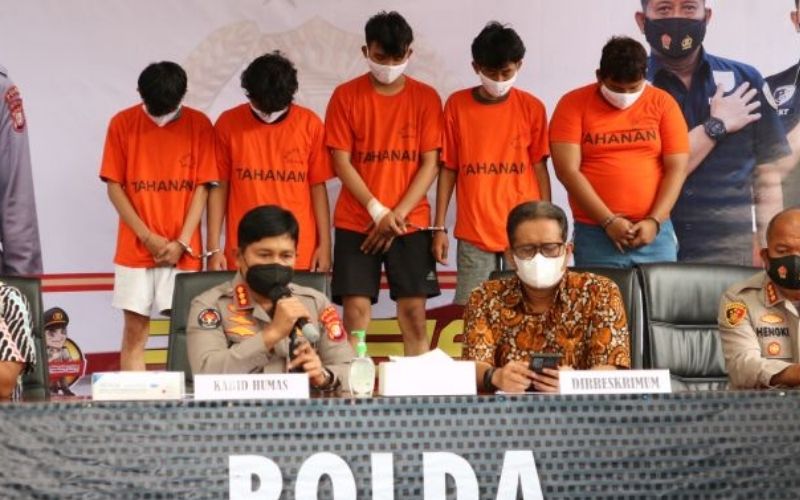 Polisi kemudian menghadirkan para tersangka pelaku dalam jumpa pers di Polda Metro Jaya. Meskipun hanya lima yang bisa dihadirkan, karena dua di antaranya berstatus anak di bawah umur.