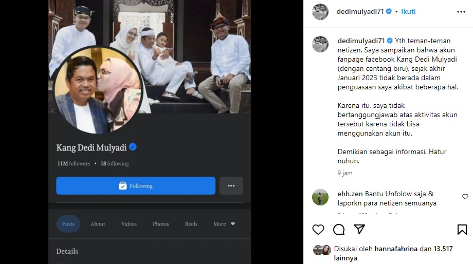 “Yth teman-teman netizen. Saya sampaikan bahwa akun fanpage facebook Kang Dedi Mulyadi (dengan centang biru), sejak akhir Januari 2023 tidak berada dalam penguasaan saya akibat beberapa hal.”