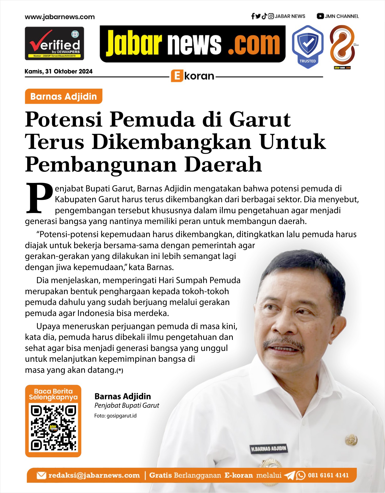 Beranda E-Koran Barnas Adjidin: Potensi Pemuda di Garut Untuk Pembangunan Daerah E-KoranBarnas Adjidin: Potensi Pemuda di Garut Untuk Pembangunan DaerahRedaksi0 min baca31 Oktober 2024 - 05:062 November 2024 - 05:09×Barnas Adjidin: Potensi Pemuda di Garut Untuk Pembangunan DaerahSebarkan artikel ini Baca Juga: Sekolah Negeri di Kota Bogor akan Bertambah Berita TerkaitE-KoranAi Saadiyah Dwidaningsih: Program Jabar Caang Sediakan Listrik Bagi 121.871 KeluargaE-KoranFarabi El Fouz: RS Paru Sidawangi Tingkatkan Layanan Kesehatan RegionalE-KoranDedi Mulyadi: Jalan Tol Pasteur-Lembang Untuk Atasi Kemacetan BandungE-KoranErni Daryanti: Perubahan Undang-Undang Untuk Pariwisata Ramah DisabilitasE-KoranKPU Purwakarta Tetapkan Paslon Zeinjo Sebagai Pemenang Pilkada 2024E-KoranBey Machmudin: Jawa Barat Siap Luncurkan Program Makan Bergizi Gratis