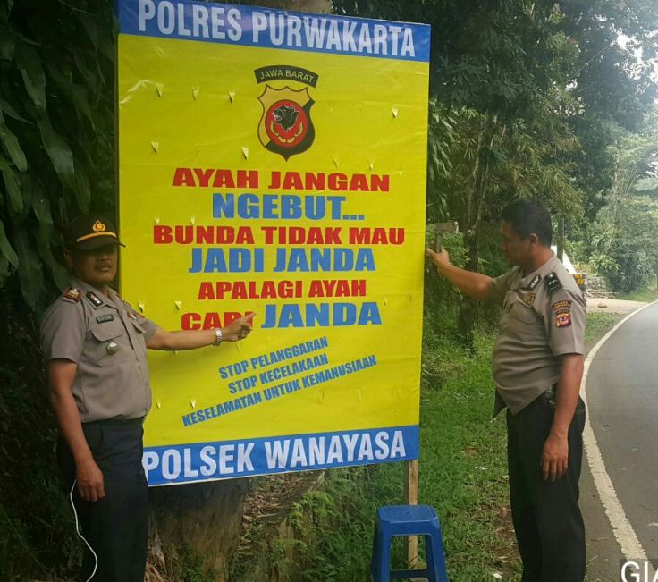 Seperti yang dilakukan anggota Polsek Wanayasa, Purwakarta. Papan peringatan bertulisakan “Ayah jangan ngebut Bunda tidak mau jadi janda, apalagi ayah cari janda”, dipasang Polsek Wanayasa di sepanjang jalan raya Wanayasa.