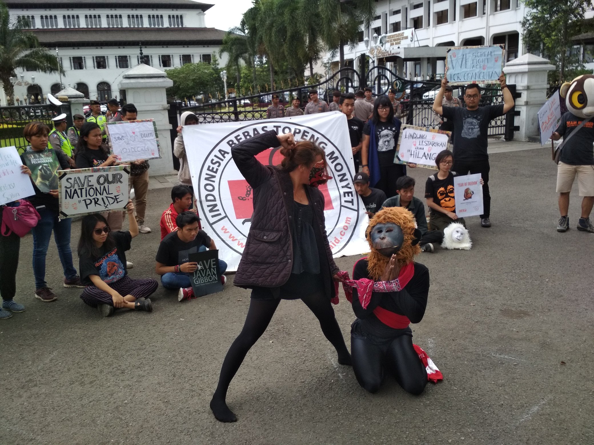 Massa aksi perwakilan Jakarta Animal Aid Network (JAAN) menggelar aksi damai dalam rangka memperingati Hari Primata Nasional di Pelataran Timur Gedung Sate, Selasa kemarin.