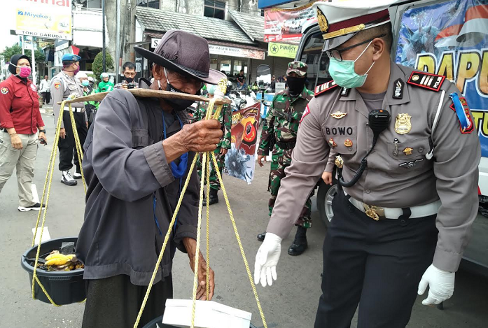Terlihat, polisi dari Polres Purwakarta membagikan 300 paket nasi kotak kepada pengemis, pengamen tukang ojek, pedang keliling hingga warga yang melintas di jalur tersebut, pada Rabu (15/4/2020).