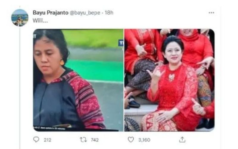 Pemilik akun Twitter @bayu_bepe dalam unggahannya menampilkan kolase foto Rara sang pawang hujan yang disandingkan dengan Puan Maharani.