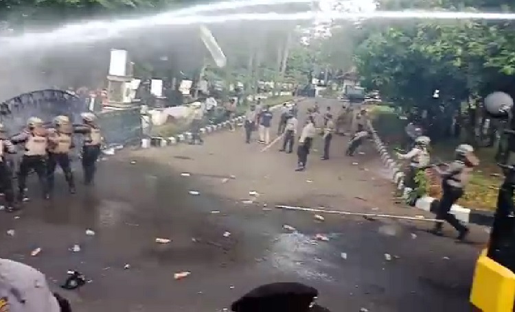 Polisi berusaha menghalau para pengunjuk rasa dengan water canon dan juga gas air mata. Namun, para pengunjuk rasa yang terdiri para buruh dan mahasiswa membalas dengan lemparan batu, botol air mineral, hingga bambu di tengah kerumunan yang mengarah ke para petugas yang berjaga di area depan gedung DPRD Purwakarta. (Gin)