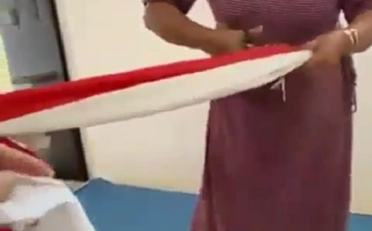 Dalam video itu, nampak seorang ibu dibantu sejumlah orang lainnya untuk menggunting bendera Merah Putih dengan banyak potongan dan juga ada yang merekam aksi itu dalam video.