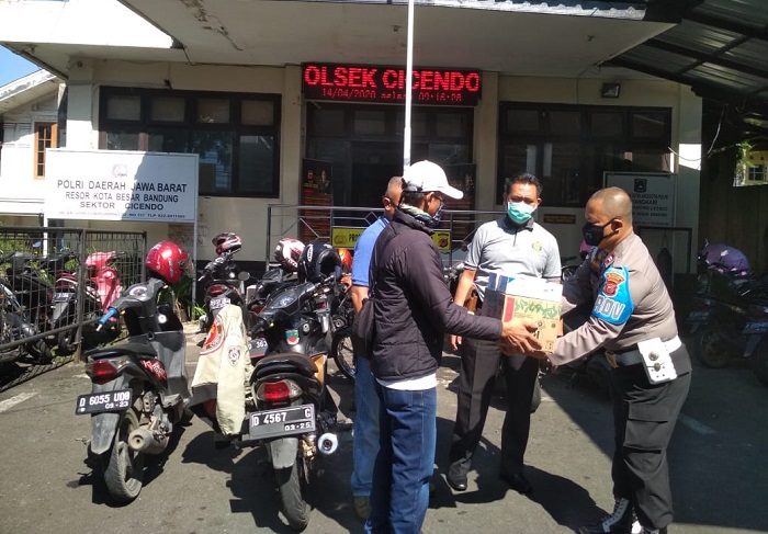 JABARNEWS | BANDUNG – Seorang pria pedagang helm secara sukarela menyumbang 1 dus masker dan sarung tangan karet (handscoon) kepada Polsek Cicendo.