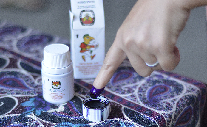 Selanjutnya, jari pemilih akan diberi tinta tanda sudah mencoblos. Pemberian tinta tidak dilakukan dengan mencelupkan jari ke botol seperti biasanya.