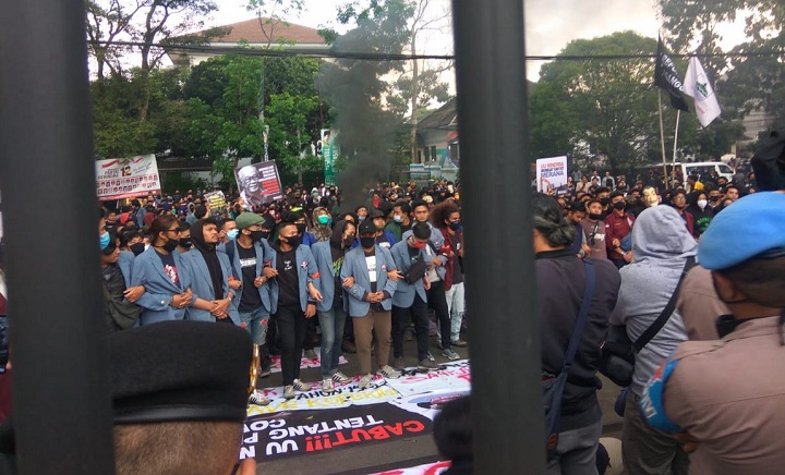 Dalam aksinya mahasiswa dari berbagai kampus di Kota Bandung ini maminta pemerintah dan DPR menghentikan pengesahan RUU Omnibus Law Cipta Kerja.