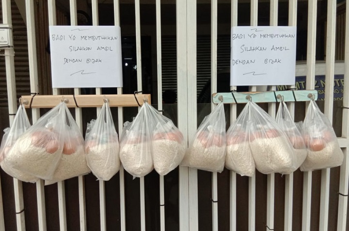 Di bawah pengumuman tersebut, tergantung sejumlah paket bahan kebutuhan pokok yang dikemas dalam kantong keresek. Paket yang digantung tersebut berisi 1 kilogram beras, 3 butir telur, dan minyak sayur.