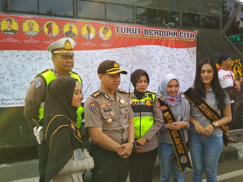 JABARNEWS | BANDUNG – Di Dago car free day, Kota Bandung Minggu (13/05/2018) pagi. Polda Jawa Barat menggelar acara giat dukungan masyarakat sebagai ucapan belasungkawa atas gugurnya keenam anggota Polri pada kerusuhan di Mako Brimob oleh napi terorisme 8-10 Mei 2018 lalu.