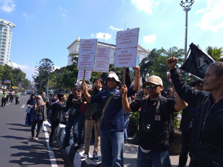 Dalam aksinya mereka menuntut Polrestabes Bandung mengusut tuntas kasus kekerasan yang diduga dilakukan oleh oknum polisi terhadap Jurnalis Pers Kampus Suaka Universitas Islam Negeri Sunan Gunung Djati (UIN SGD) Bandung, Muhammad Iqbal saat meliput aksi massa penolakan rumah deret Tamansari di Kantor Walikota Bandung, Jln. Wastukencana, Kamis (12/4/2018) kemarin.