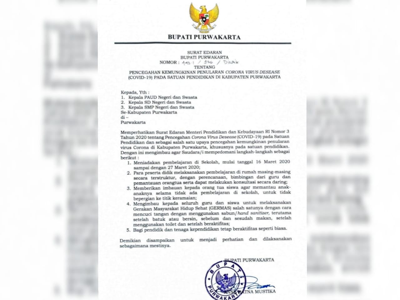 Melalui Surat Edaran Nomor: 443.1/936/Disdik terdapat 5 (lima) poin yang diimbau Bupati Purwakarta. Dalam surat edaran tersebut, Bupati Purwakarta, Anne Ratna Mustika meminta agar seluruh warga Kabupaten Purwakarta untuk meningkatkan kewaspadaan diri dengan berperilaku hidup bersih dan sehat di berbagai tempat, serta menghindari keramaian dan perjalanan tidak penting.