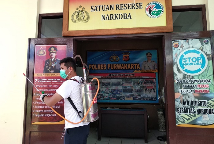 Menurut Kapolres Purwakarta, AKBP Indra Setiawan melalui Kasat Res Narkoba AKP Heri Nurcahyo, untuk itu, upaya-upaya sterilisasi tempat kerja di intansi kepolisian untuk mencegah penyebaran Covid-19 itu akan dilakukan minimal seminggu sekali. Diantaranya penyemprotan desinfektan juga dilakukan pada Kantor Satres Narkoba Polres Purwakarta.